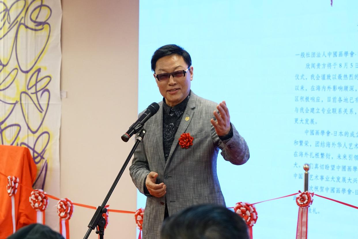 从洛杉矶赶来的中国画学会(美国)会长赵建民回顾了与中国画学会携手普及中国文化的桩桩义举,他幽默地表示,中国画学会·日本的成立,有如兄弟之降生,他代表中国画学会(美国)特聘韩学中为荣誉会长,并表达了与中国画学会、日本会共同推动中国画走出去,让世界人民了解中国艺术的心愿。