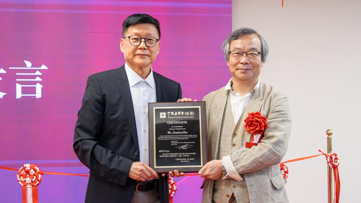 远道而来的前大分县竹田市市长、丰后南画SAIKO会理事长首藤胜次,与中国画学会·日本副会长、横滨国立大学教授、令和日中文化艺术交流协会理事长赤木范陆,在致辞中溯忆南画在日本的传承及影响,感谢韩学中为推动日中文化交流以及中国山水画在日本的赓续、普及而持续做出的努力,期待中国画学会·日本在未来不断结出硕果。